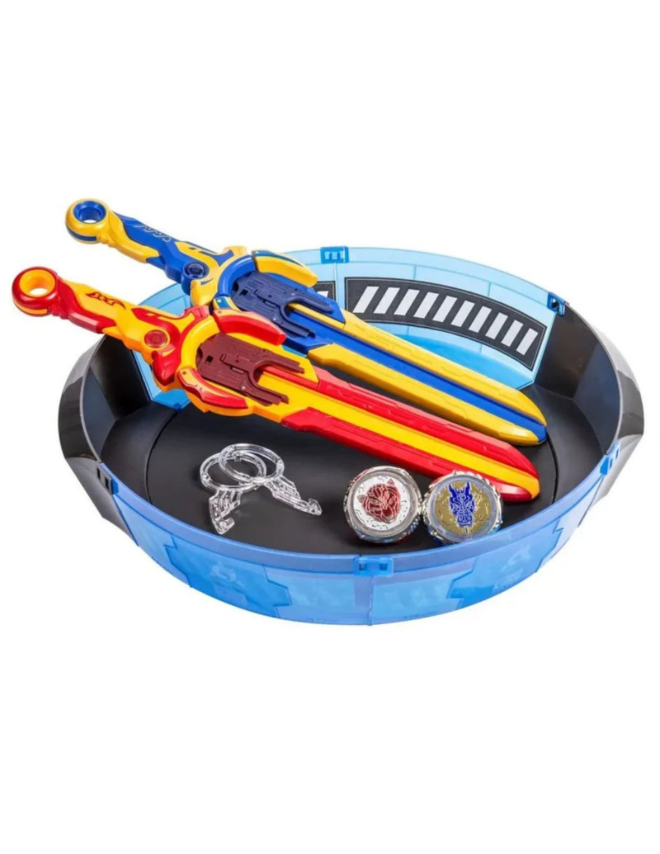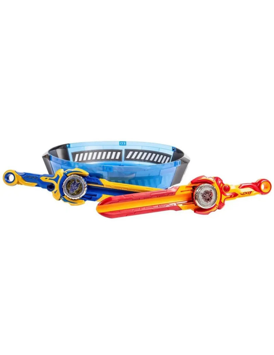 - ESPECTACULAR LUCHA DE ESPADAS Y TROMPOS! Recoge esta espada y lucha juntos: esta es la espada del guerrero Nuestro kit de tops de batalla incluye Beystadium, 2 trompos metálicos y 2 lanzadores de espadas. Toma el lanzador de espada en tu mano, inserta la parte superior del giroscopio en el lanzador, tira de la vaina hacia adelante y hacia atrás para acelerar el giro giratorio (la parte superior del giroscopio se iluminará automáticamente mientras gira el giroscopio), y presiona el botón en el mango cuando apuntes al lente, y el giroscopio se disparará rápidamente. ¡La gran batalla está a punto de comenzar!