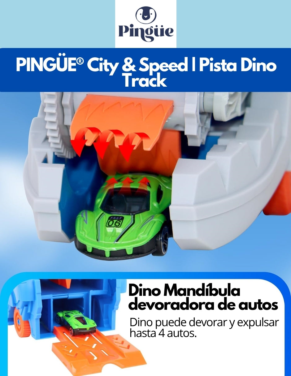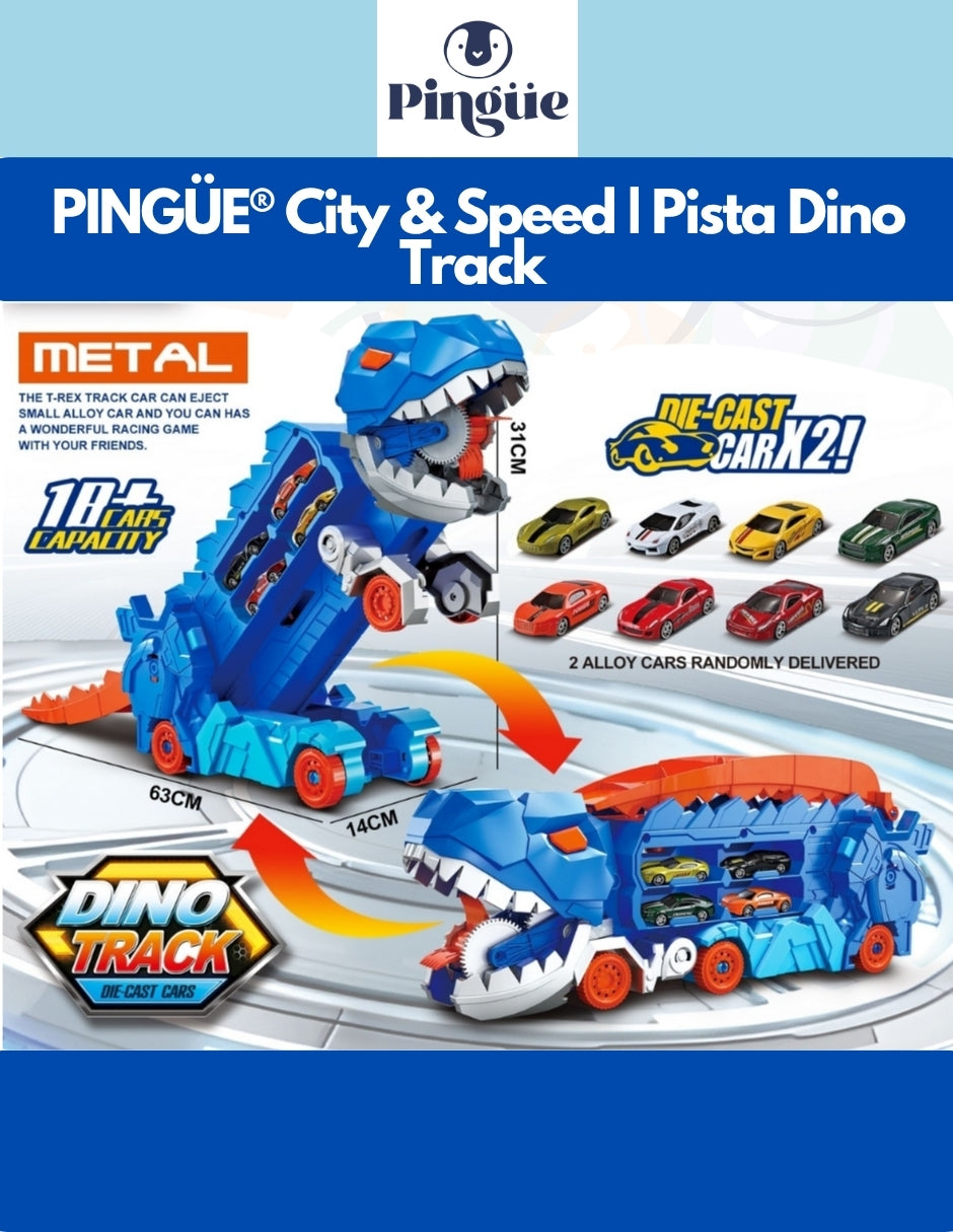 ¡La aventura y la velocidad se combinan con el set PINGÜE® City & Speed! Este increíble conjunto de pista Dino Track es perfecto para pequeños aficionados a los autos y la acción. Diseñado para ofrecer horas de diversión, su sistema de alta velocidad garantiza carreras emocionantes para vehículos a escala 1:64, mientras que su diseño único de dinosaurios aporta una experiencia dinámica y llena de sorpresas.