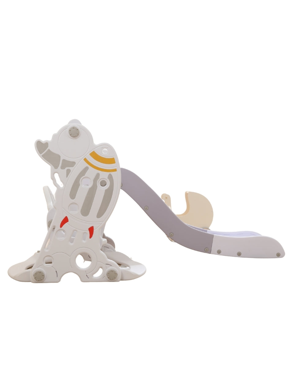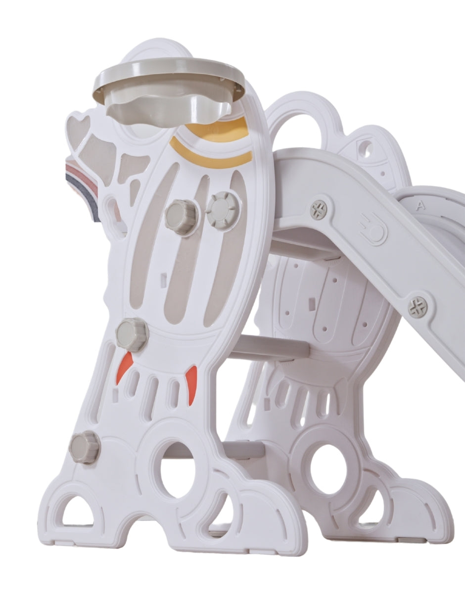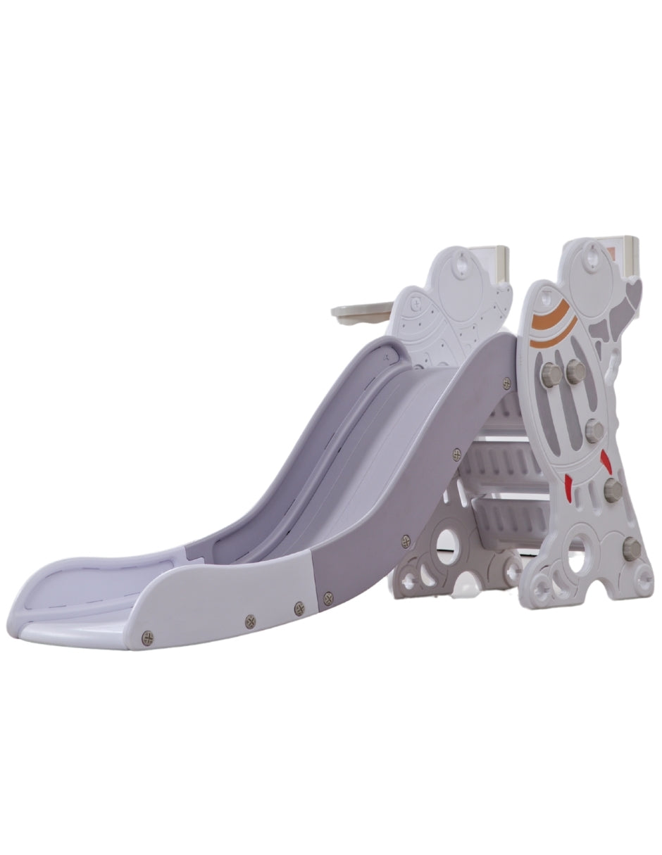 Este modelo 2 en 1 combina una resbaladilla y una canasta de basquetbol, ofreciendo una experiencia de juego completa que fomenta tanto el ejercicio físico como la coordinación.