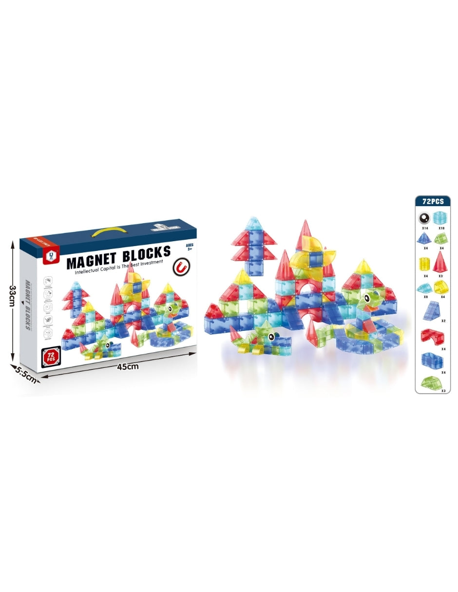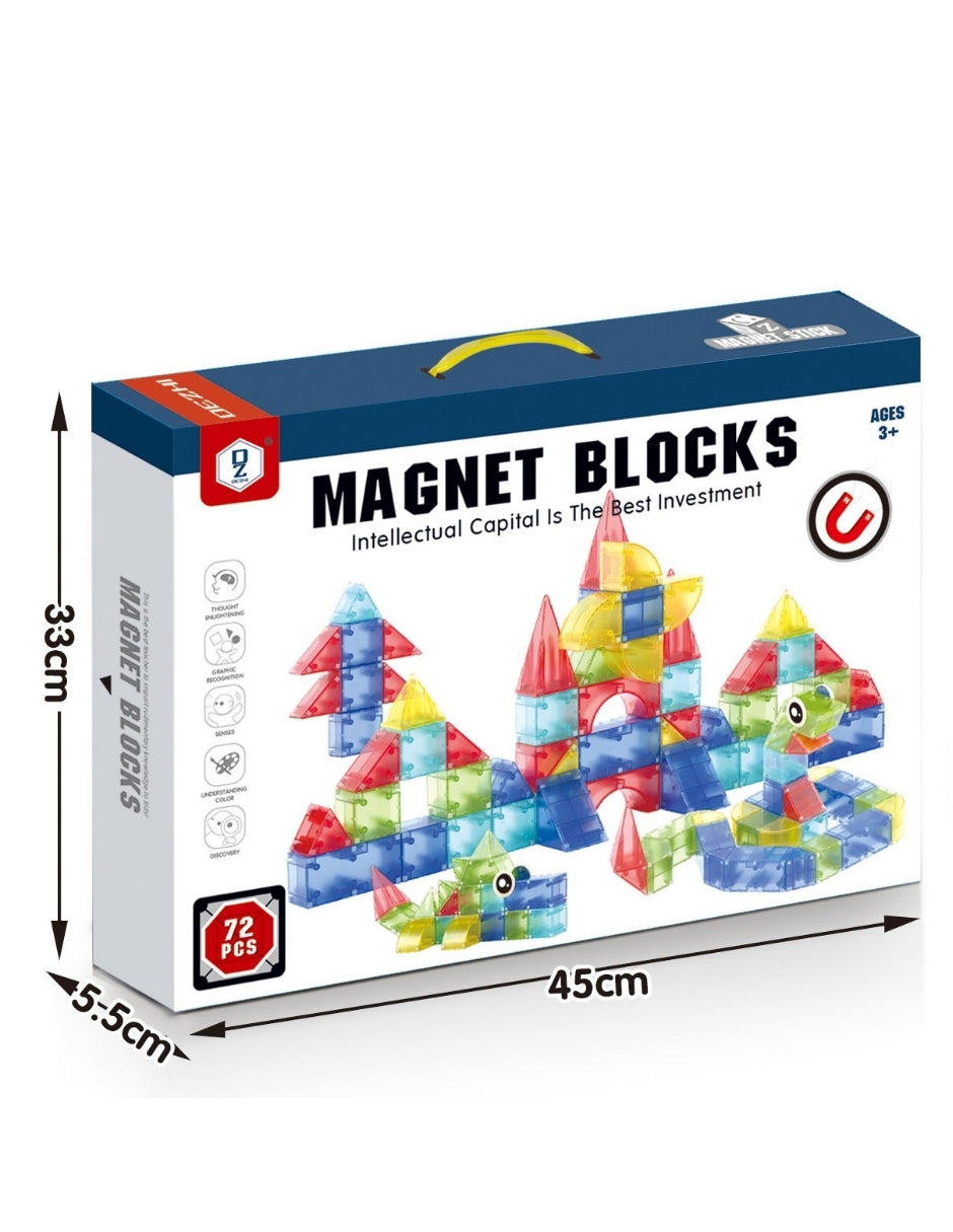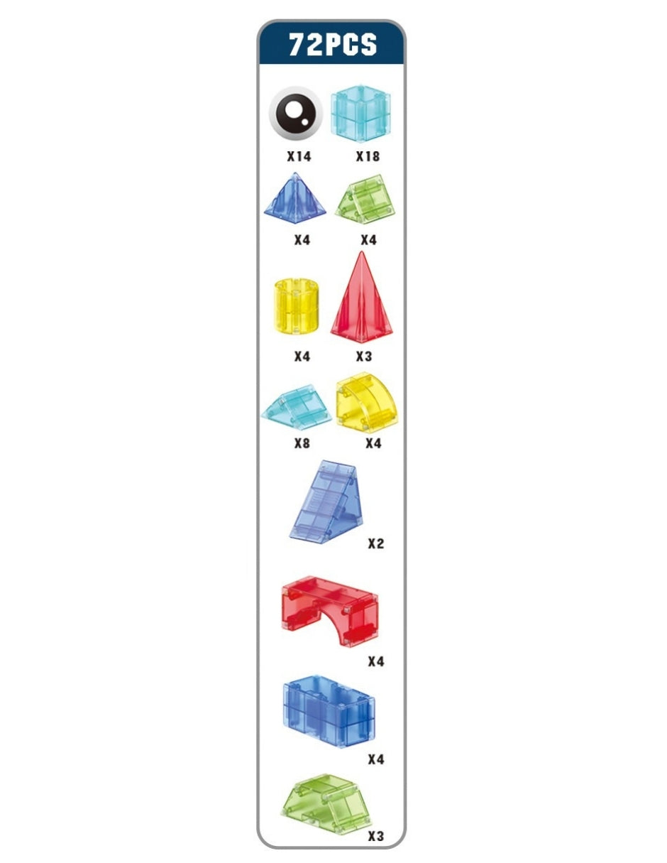 - Set Completo: Incluye 72 piezas magnéticas de colores brillantes, perfectas para construir figuras geométricas en 3D y desarrollar proyectos más complejos.