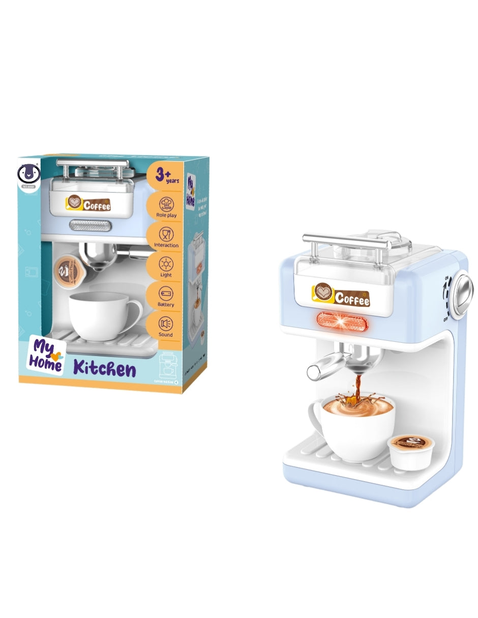 Con luces y sonidos. Cafetera estilo italiano a escala tipo SMEG o KitchenAid. Eléctrico. Utiliza 2 baterías AAA no incluidas. Accesorios con cambio de color para simular cocción. Tamaño del empaque 21 x 18 x 23 cm. Color Azul Pastel.
