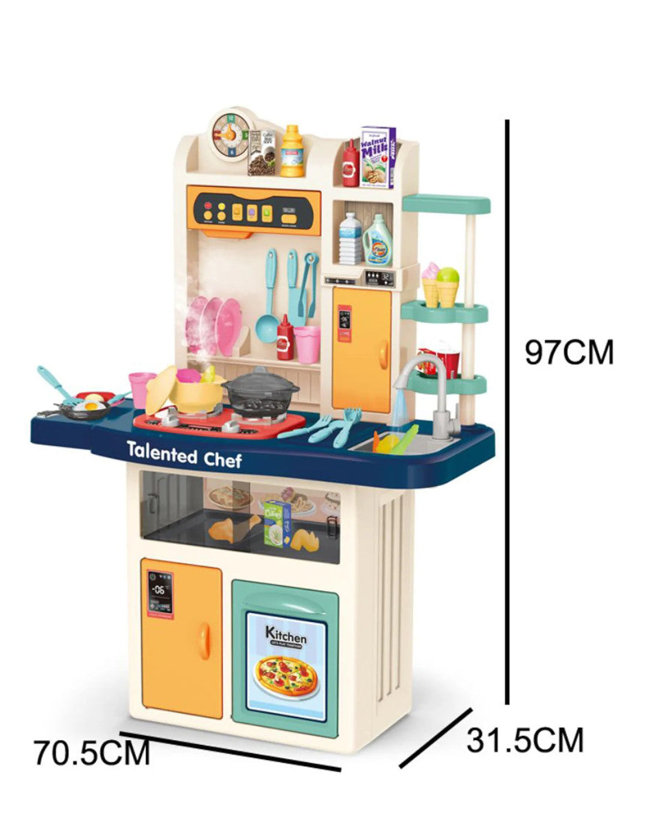 • MÚLTIPLES ACCESORIOS: el diseño del set de cocina infantil con accesorios presenta variedad de funciones para el aprendizaje y diversión de los niños, parrillas con luz y sonido, perillas con efectos y set de verduras, platos, ollas, utensilios y más accesorios.